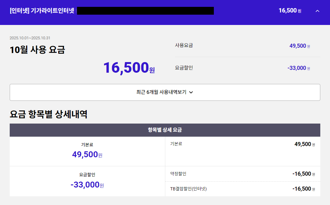 1. 인터넷 500메가는 백메가 안내받은대로 온가족할인과 함께 묶어서 50% 할인받았고