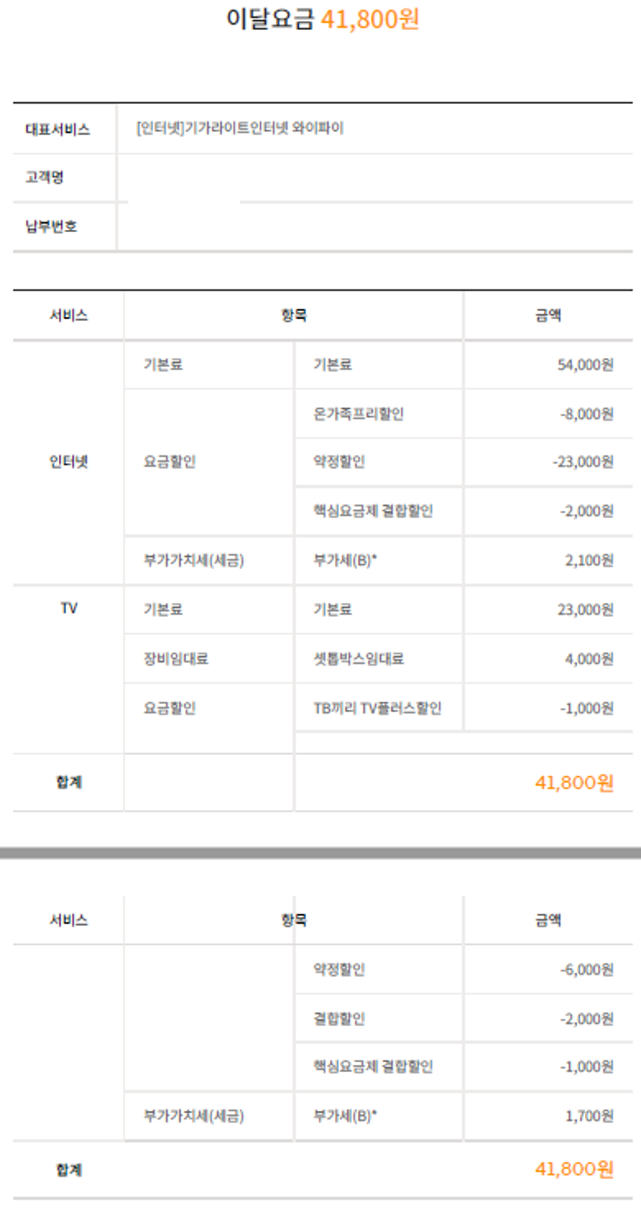 위에는 인터넷+TV 요금이구요~