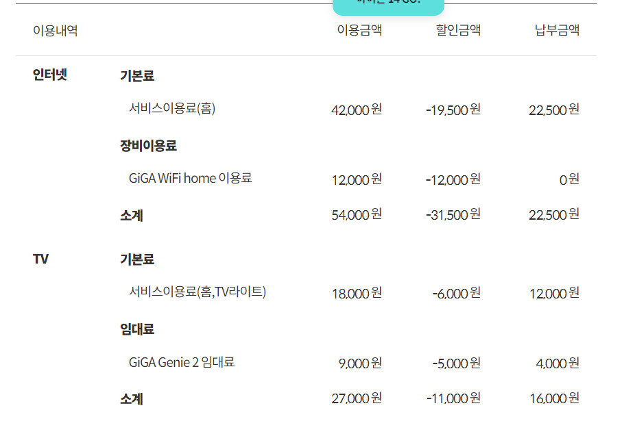 요금은 티비 요금 17500원 , 인터넷 22400원 , 핸드폰은 36000원 나오고 있습니다"