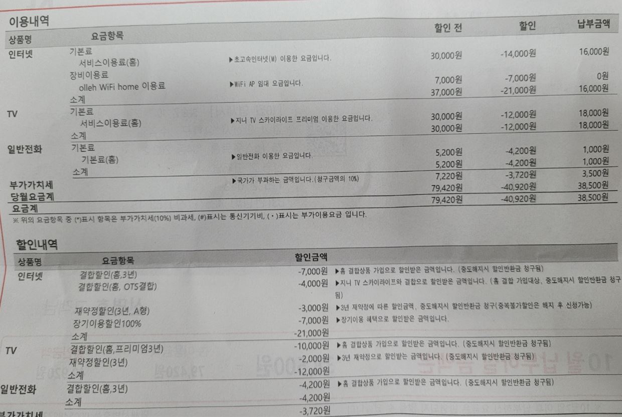 현재 KT 홈이라는 결합상품을 이용하는 것으로 보입니다. (인터넷+TV+집전화) 잘 모르지만 제가 보기엔 할인 전 요금이 비싸보여요;