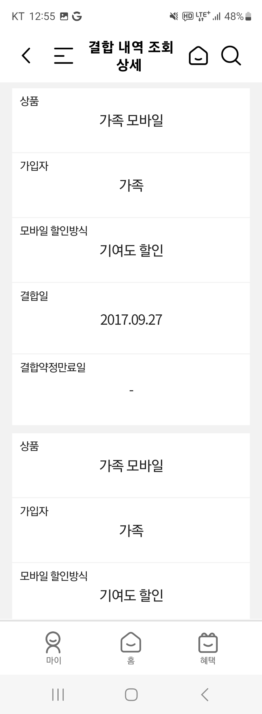 휴대폰 결합은 가족 명의 2대로 따로따로 되있는거 같습니다