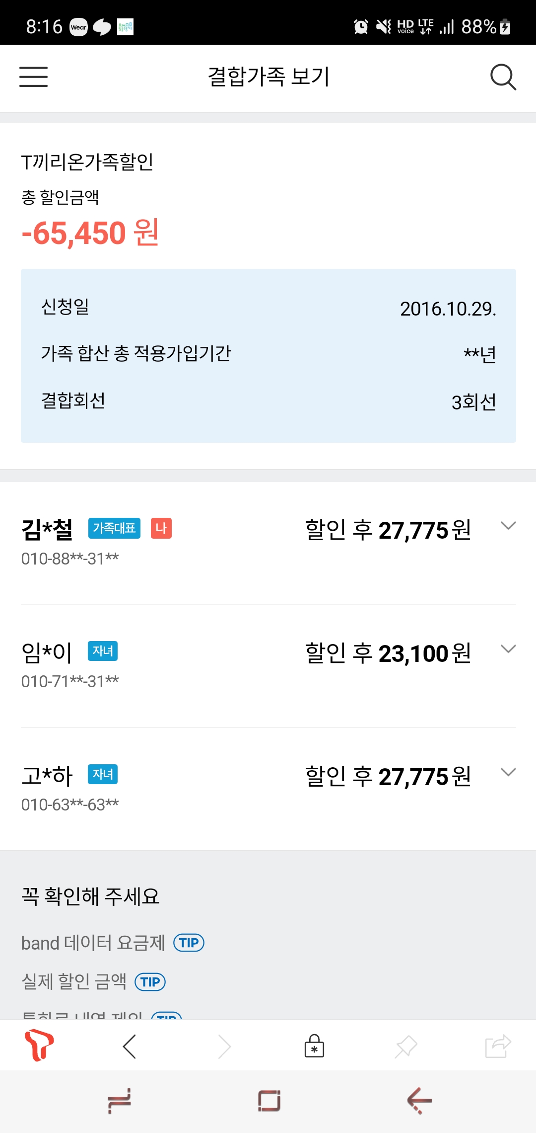 SK폰 3회선에서는 매월 총합 65,450원의 할인을,