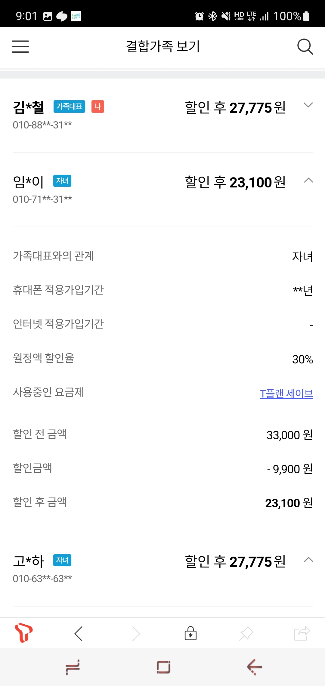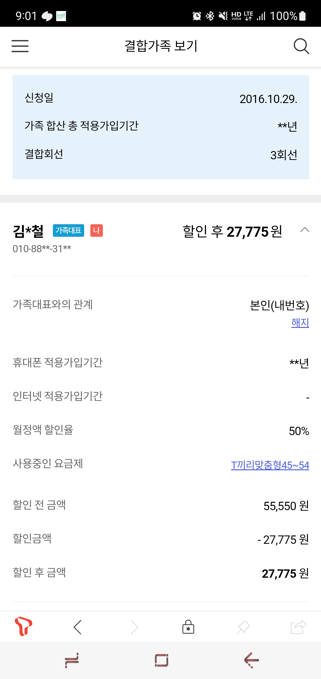 SKT 3회선 온가족할인(가입기간 30년 이상)으로 묶여 있고, 추후 통신사 변경 계획은 없습니다.