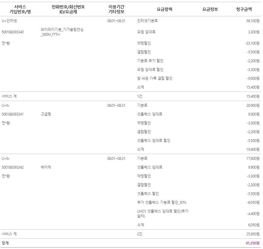 매달 실 청구되는 금액은 합계 41,250원 에서 12,000원~17,000원 할인된 금액 입니다.