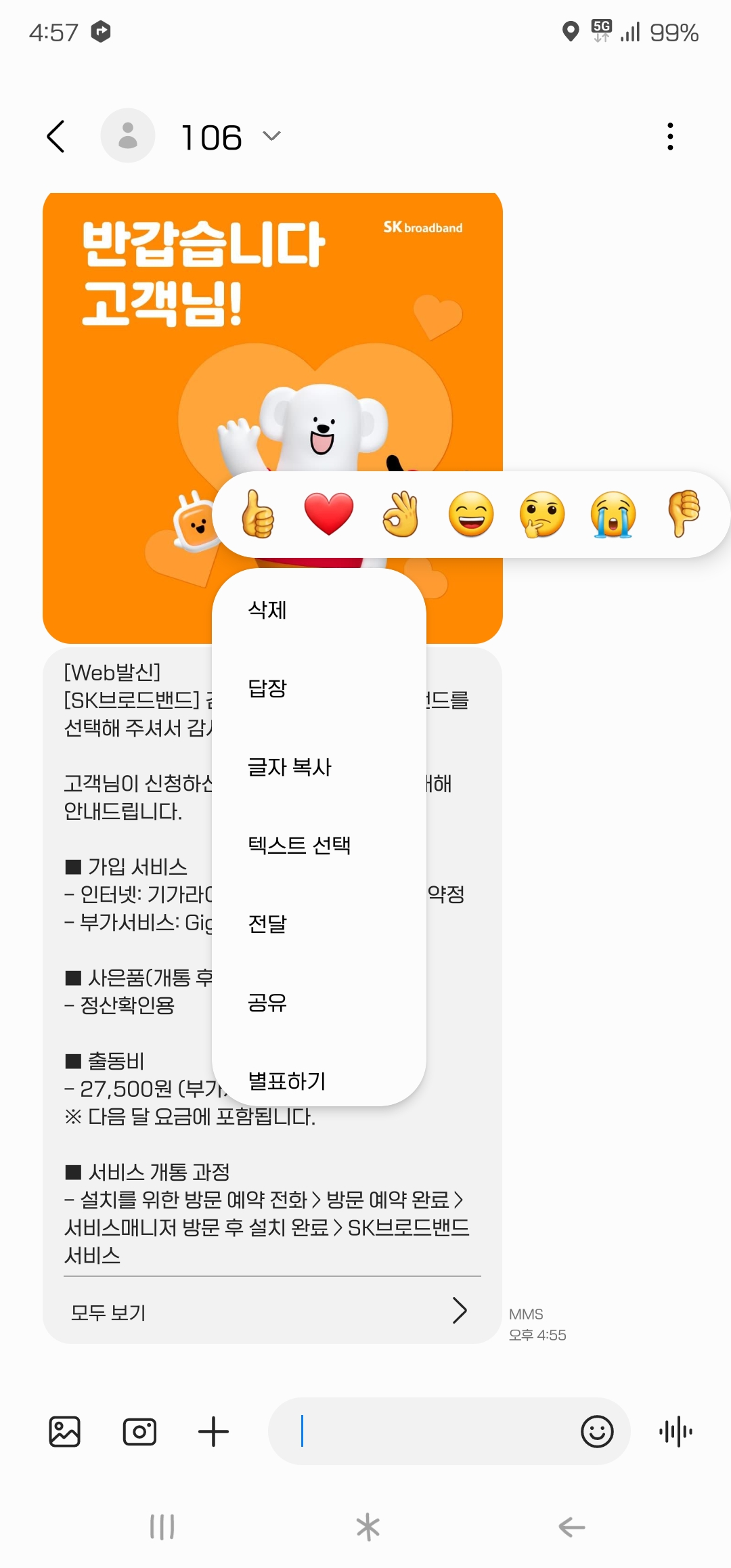 방금 SKB본사에서 신청확인문자가왔는데