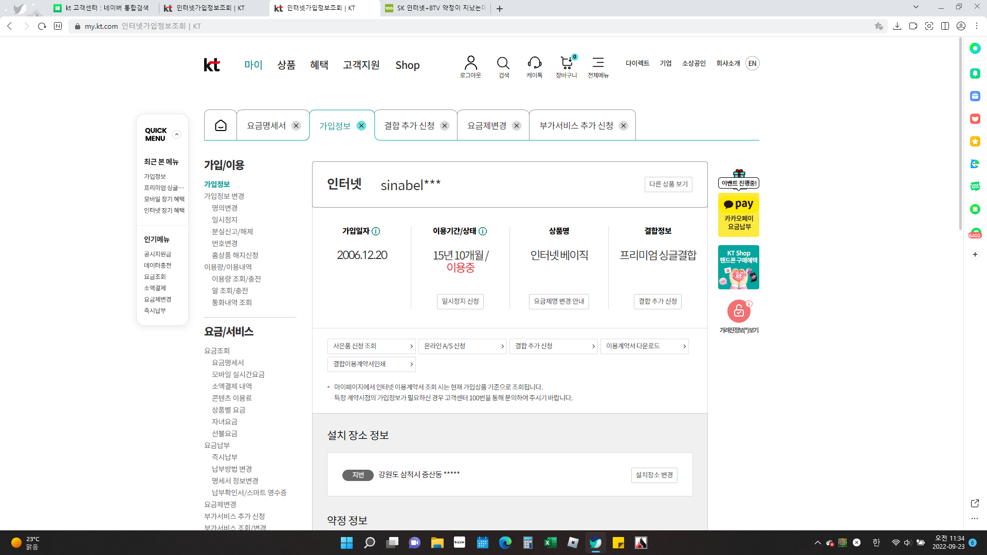 회사 인터넷은 2006년도 가입했고 인터넷 베이직 월 23,000원 부가세 별도 이고