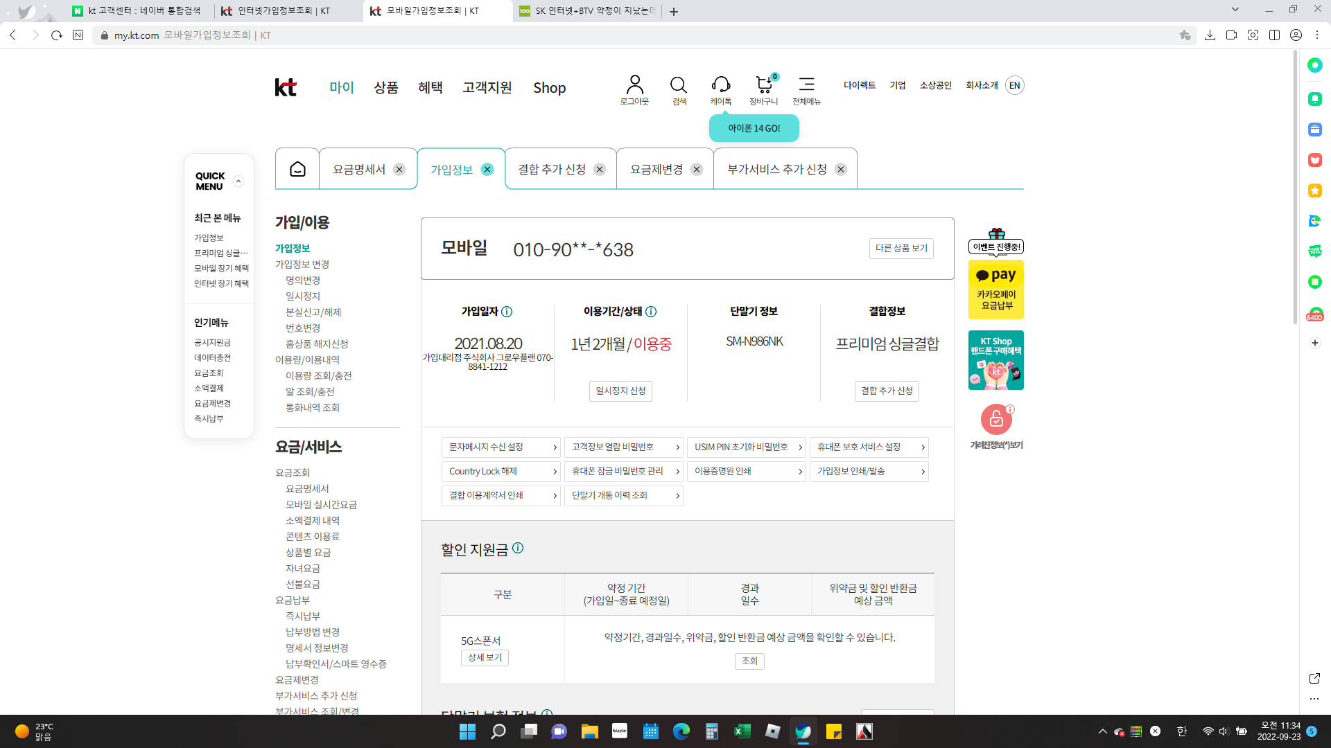 현재 회사에서 쓰시는 KT인터넷은 휴대폰 1회선을 결합해 할인을 팍팍 받고 계시네요!