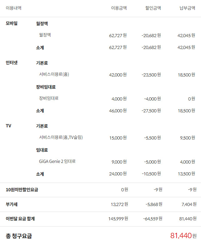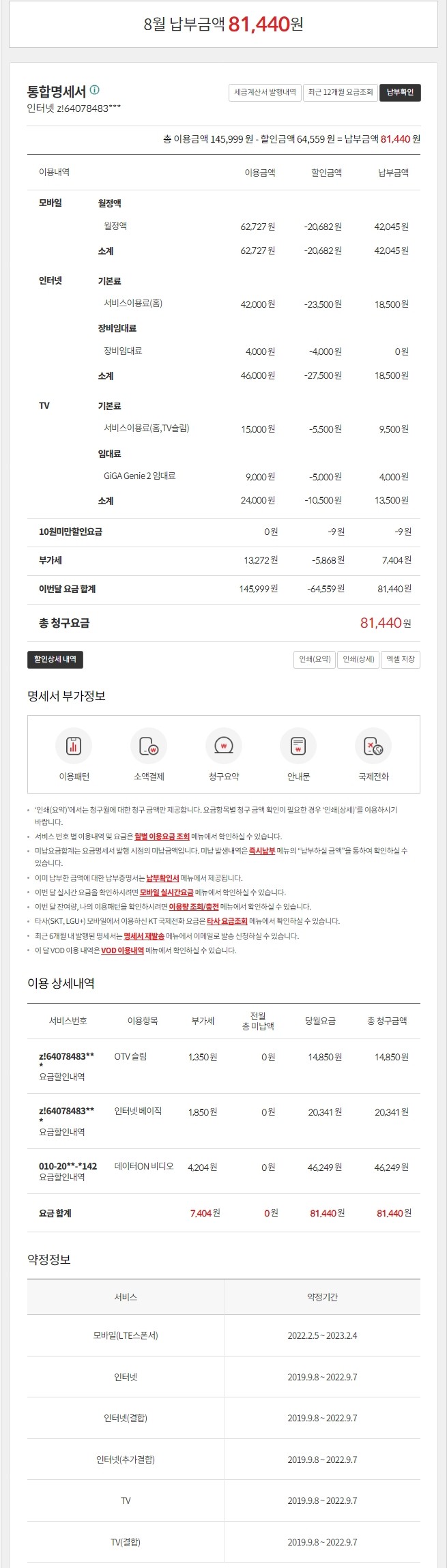 현재 아래와 같이 KT 인터넷 + TV + 모바일 2회선으로 가입하여 운영하고 있는데요,