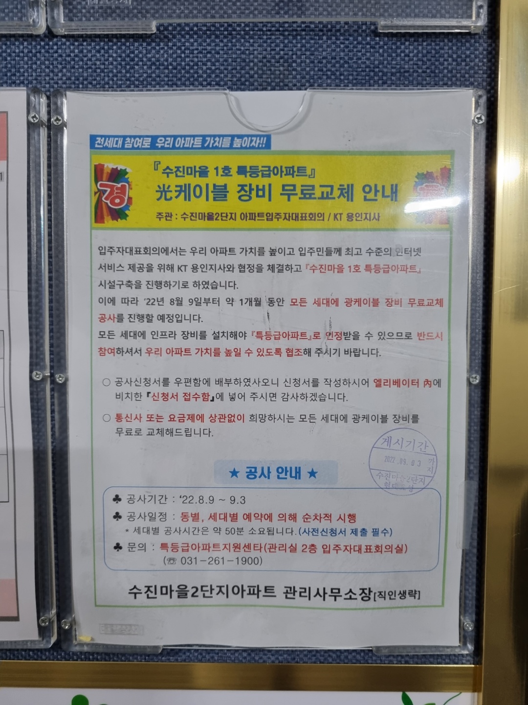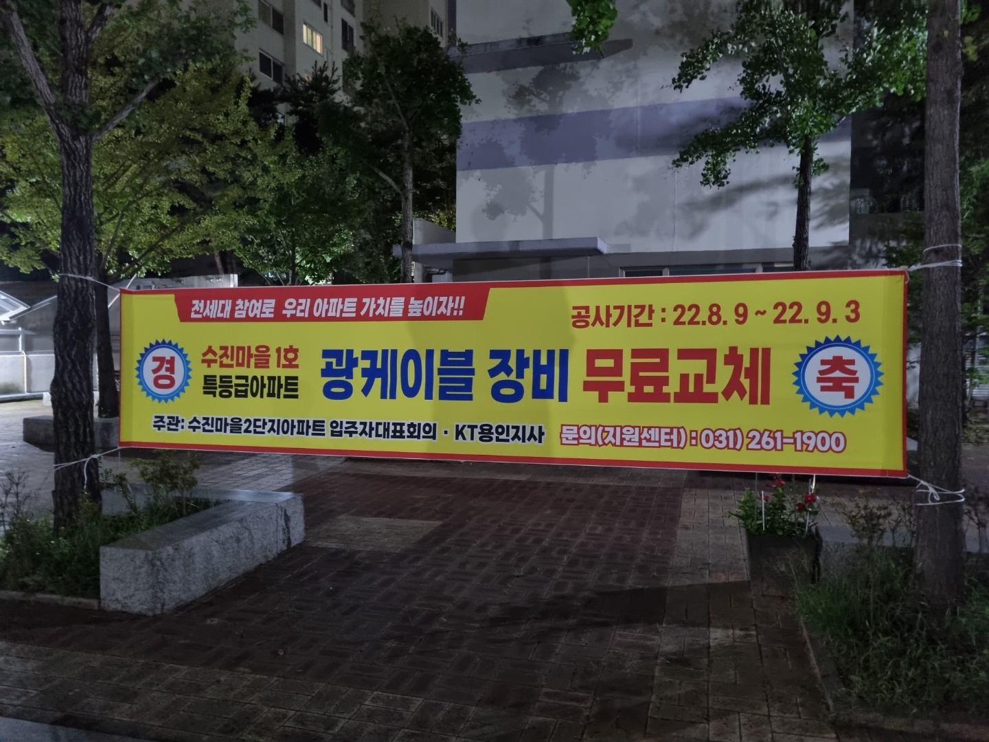 현수막이나 공구문이 붙어있었던 건 아니고 광케이블 무료교체 때문에 장비를 바꿔준다고 전화가 직접 왔거든요