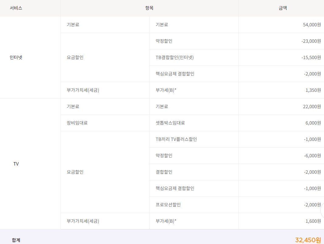 TV와 인터넷 모두 할인 받아서 월 32,450원, 핸드폰은 2만원 좀 넘게 요금 내고 있어요~