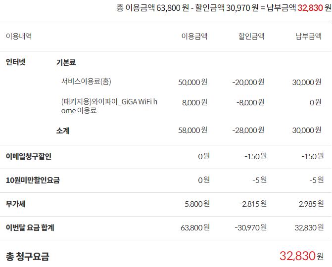 (해서, 1기가급 요금이 33,000원 청구되고 있지요)