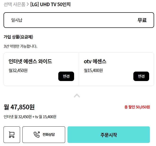 -휴대폰1대 결합(5g 심플) + 인터넷 1회선(인터넷 에센스 와이드) + tv(OTV에센스) + 사은품(50UQ8300ENF)무료