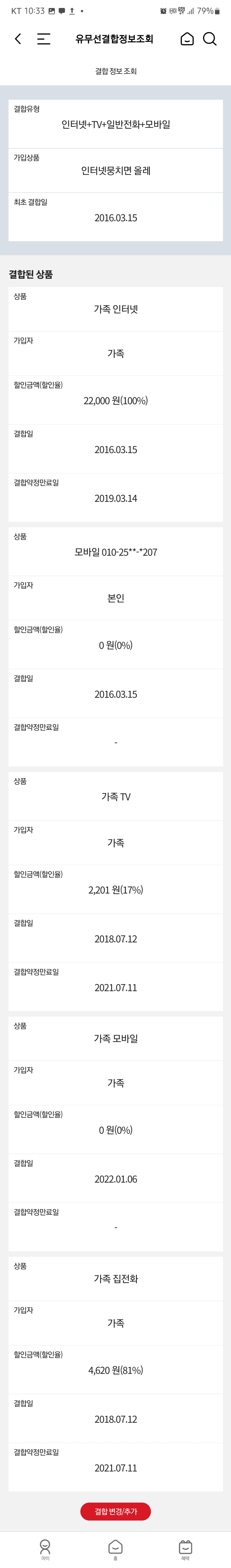 모바일, 티비, 인터넷 각각 1개회선씩 쓰고있는데 결합상품 목록을 보니까 가족걸로도 몇개 묶여있네요??