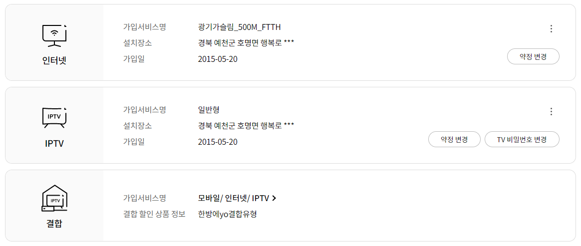 아래와 같이 인터넷 IPTV등 예전 요금제를 사용하고 있습니다.