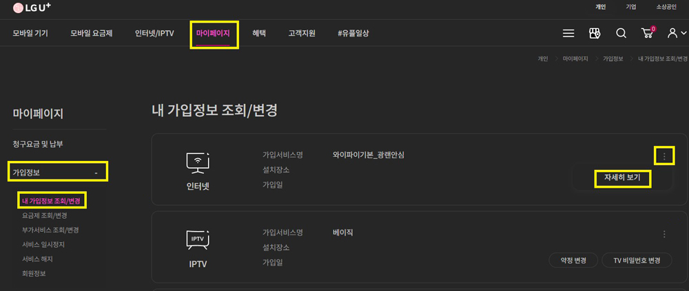 인터넷 상품의 우측 상단에 메뉴(점 세개) 버튼을 클릭하신 후 [자세히 보기]를 클릭해 주세요.