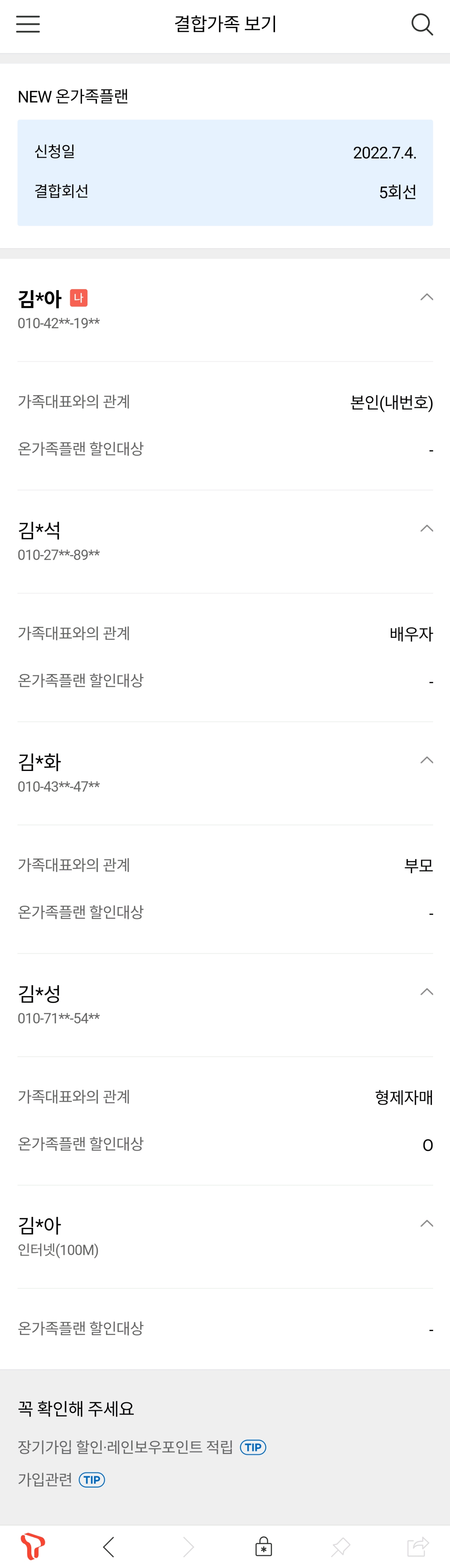 - 온가족할인 : 본가 인터넷 + 패밀리할인을 받지 않고 있는 인터넷(할머니집) + 휴대폰 4대 결합