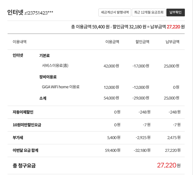 좀 꺼림찍 합니다.. 그리고 보시면 아시겠지만 이런저런 할인이 붙었지만 인터넷 제값 그대로 내고 있는거 같습니다.