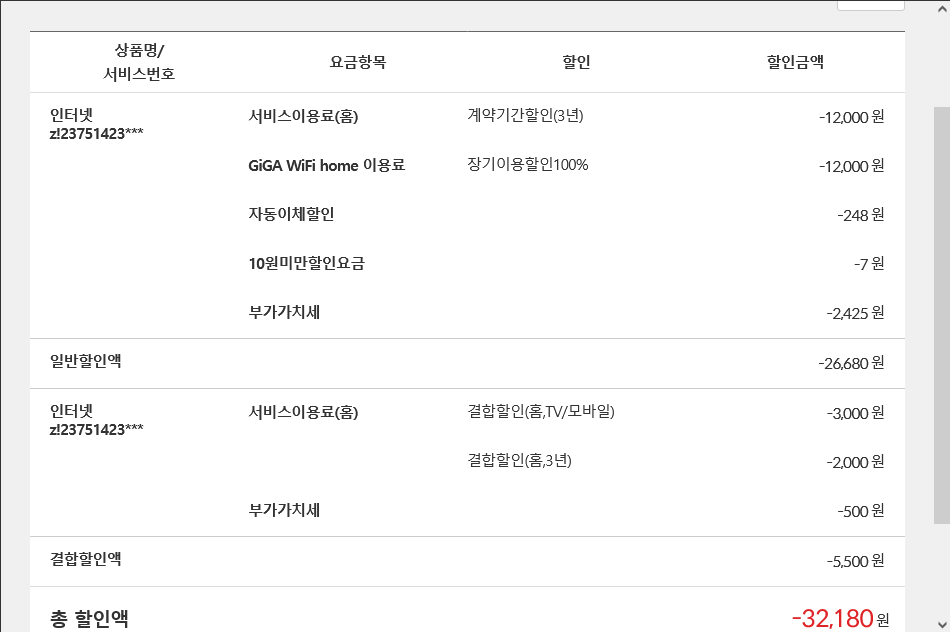 5년이 지나니 와이파이 할인내역이 장기이용할인 으로 바뀌어져 있더라구요.