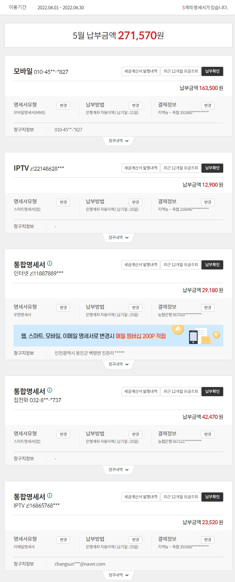 현재 어머니 모바일(5G 초이스 90000) + 어머니 인터넷(인터넷 베이직) + 아버지 모바일(5G 베이직 80000)을 총액결합으로 할인받고 계신 것 같아요.