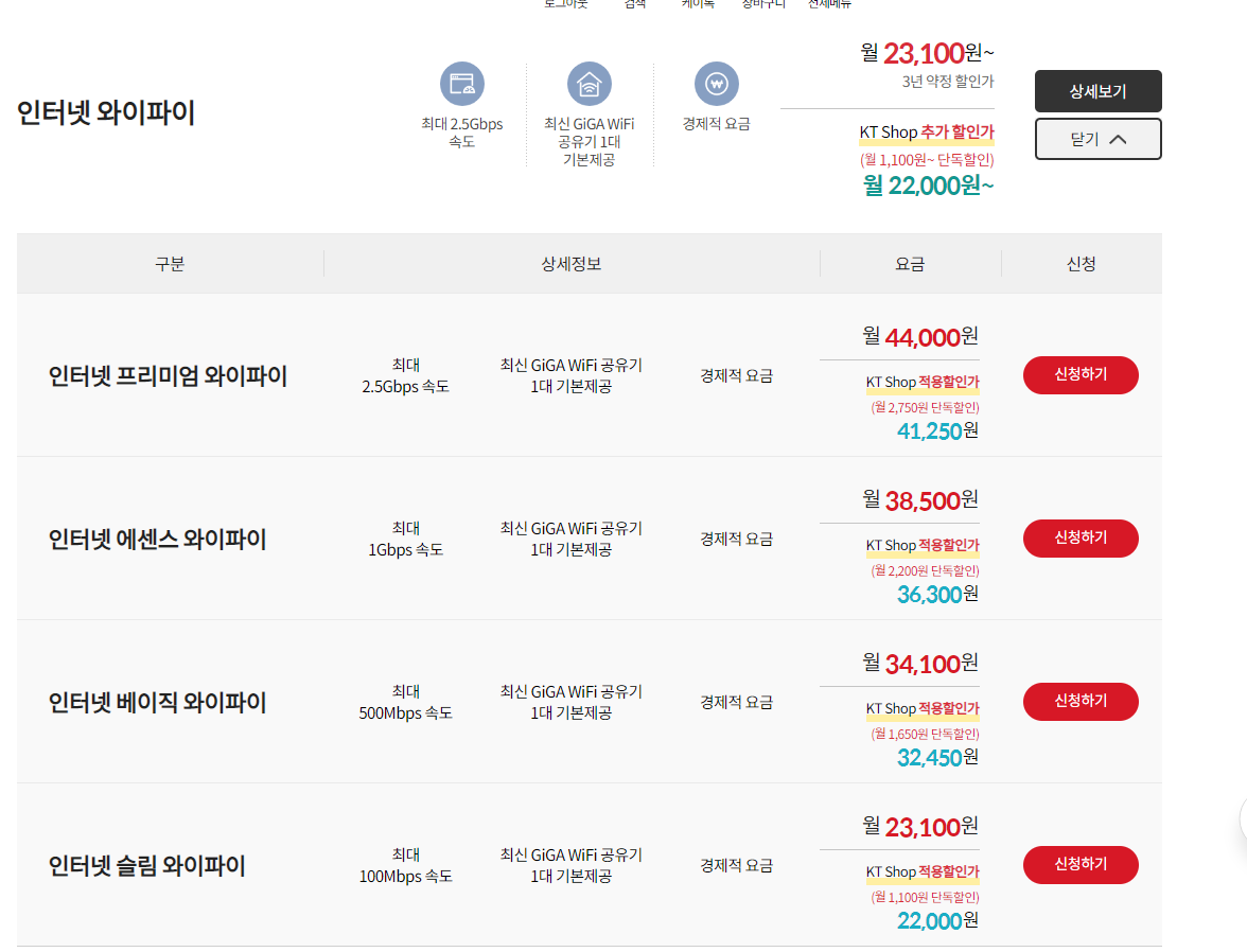 마지막이라고 하고 자꾸 여쭤보네요^^; 그리고 KT 홈페이지에서 보니 와이파이 1100원은 할인되는 것으로 나오는데요, 100메가 통해서 신청해도 마찬가지일까요? 큰 금액은 아니지만 여쭤보아요. 감사합니다!!