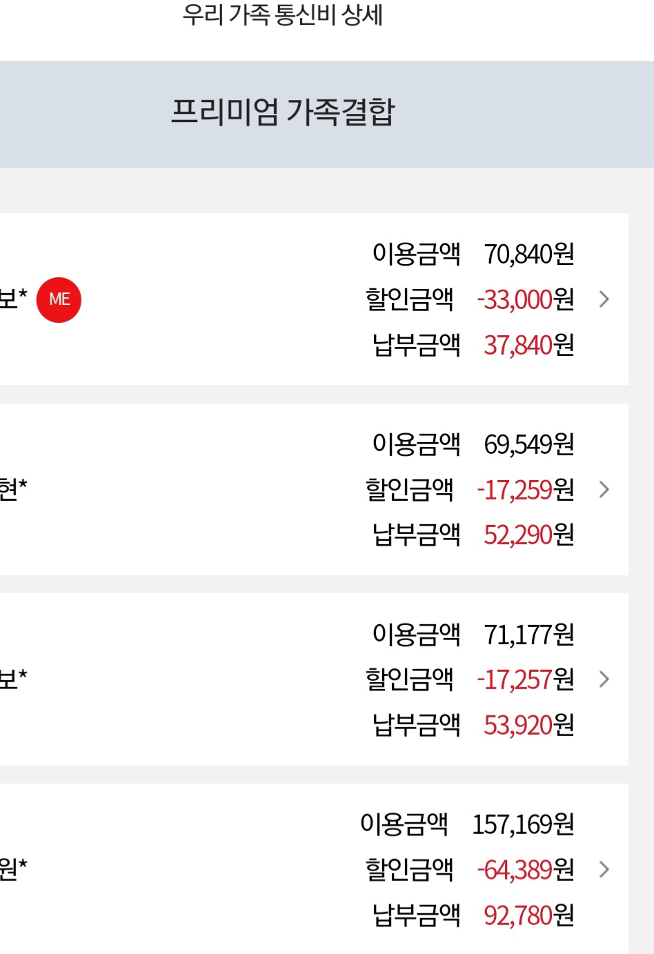 2. 가족 모두가 프리미엄가족결합을 이용하고 있으며, 가족 모두와 본가 인터넷.tv도 kt 통신사 이용중입니다. 무슨 요금제인지는 모르겠으나 가족 인터넷.tv는 할인받아 월 25000원 이내로 내는 것 같아요.