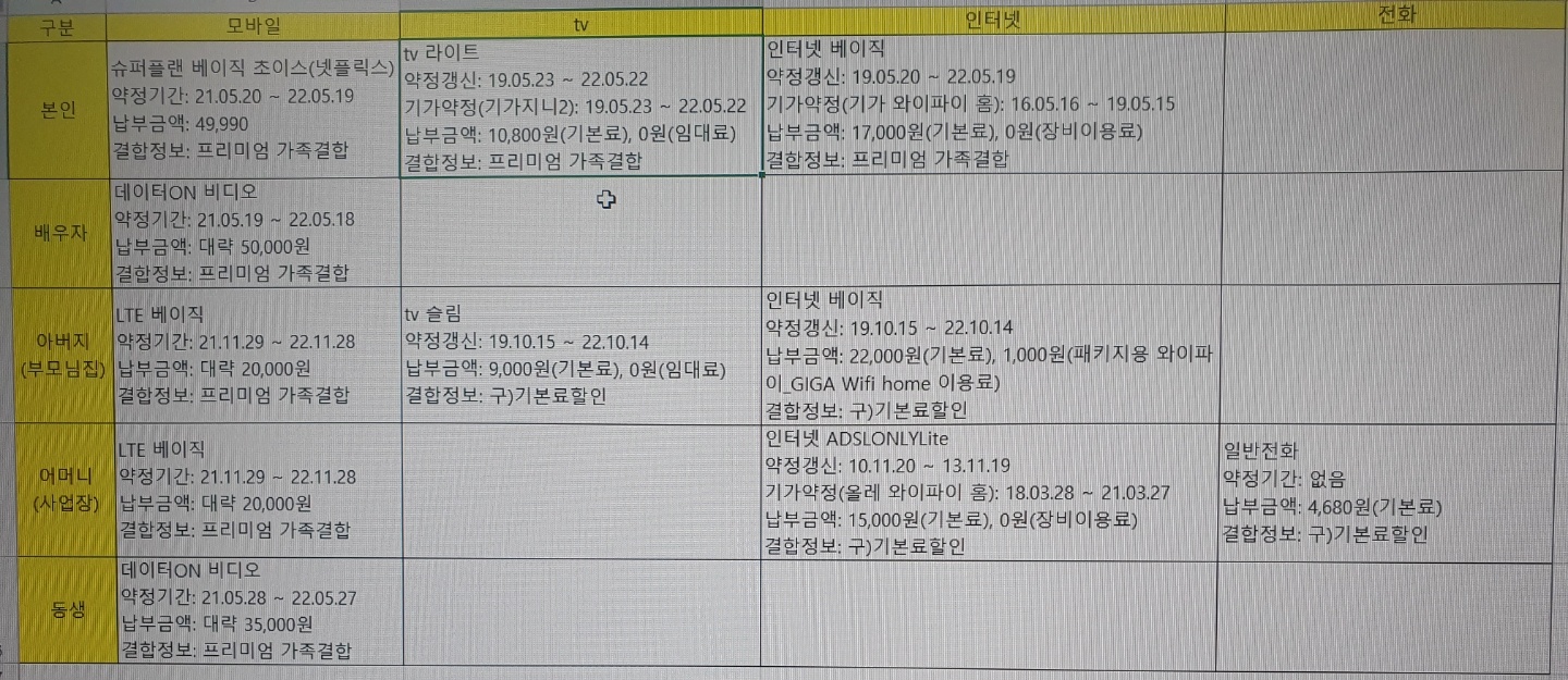부모님댁과 사업장은 여기에 자(子)회선 = 즉! '패밀리 '회선으로! 묶여있는 듯한데요~!