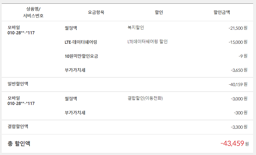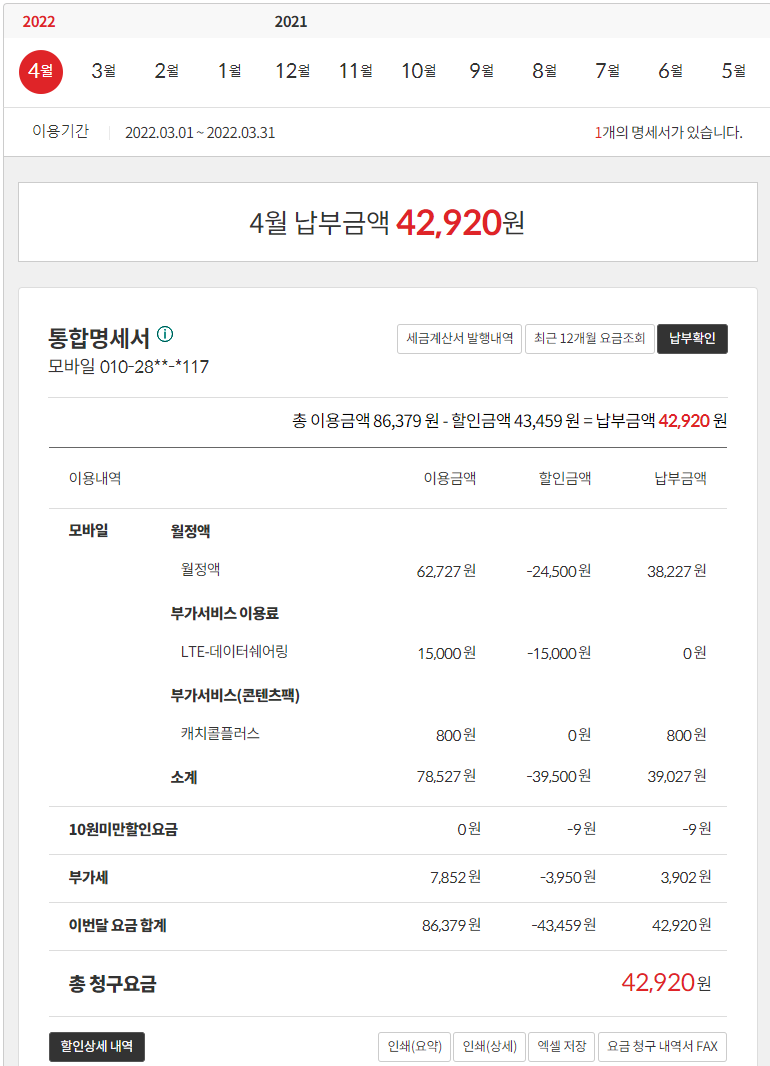 헌데.. 프리미엄 요금제라면 월정액 89,000원인데 매월 청구되는 요금이 42,920원이면