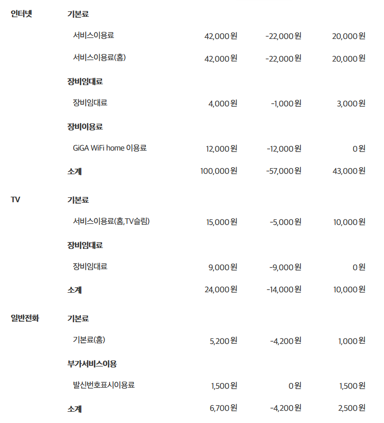 (월요금 33,000원 * 3년약정) - 사은품 10만원 + 설치비 0원 =
