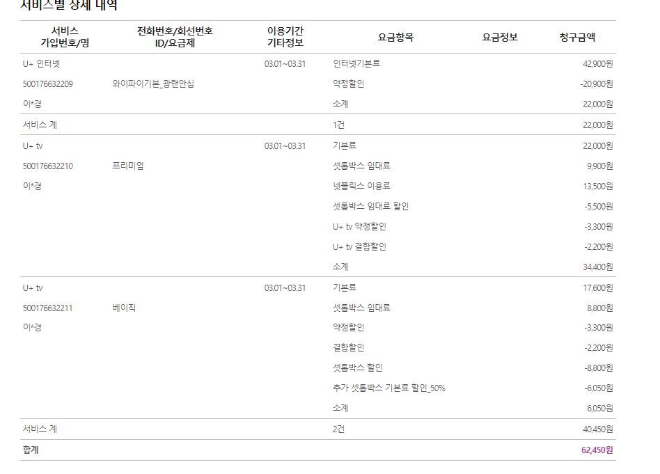 현재 인터넷 1, TV 2, 넷플릭스 월 요금 대략 62,450원 입니다.