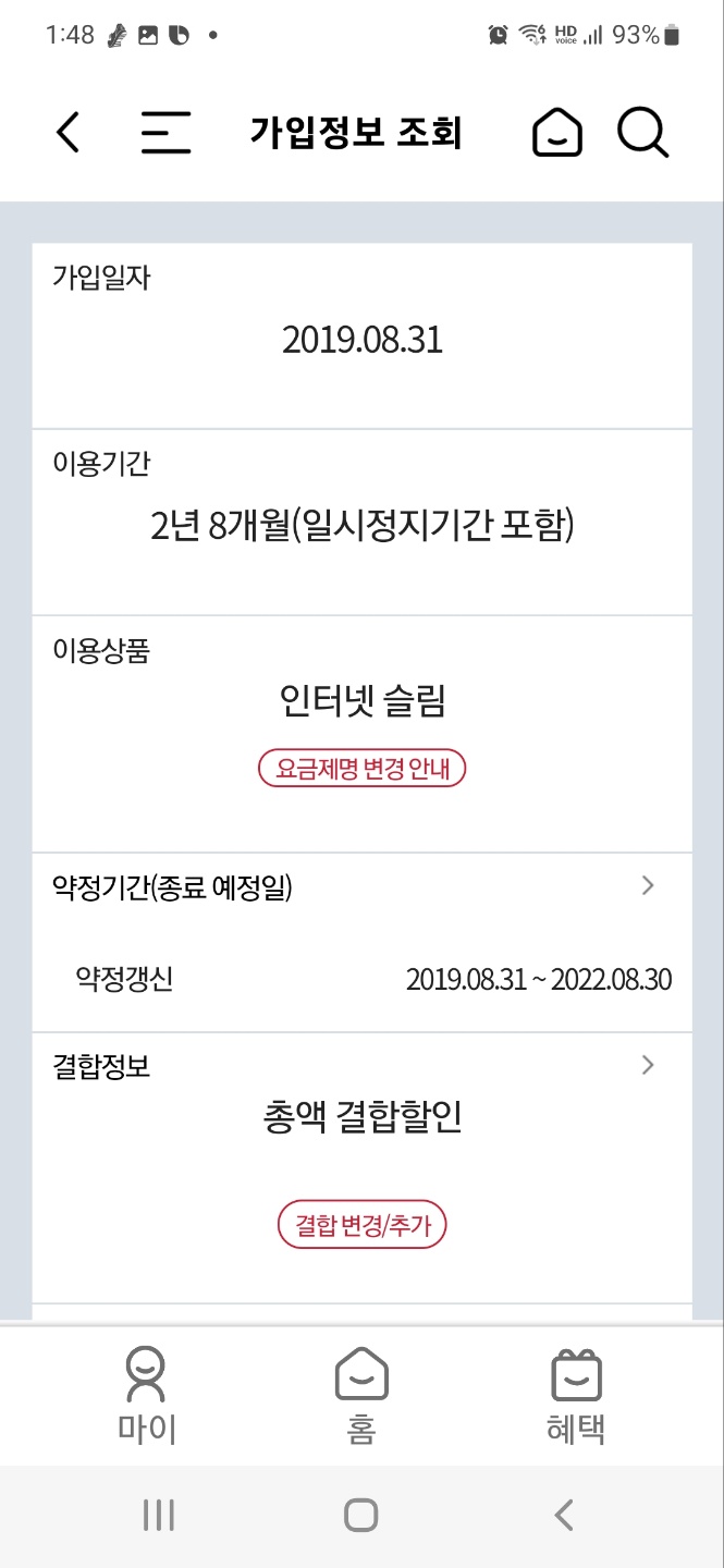 인터넷 슬림 상품 2년 약정하셨었고 현재 2년 8개월 유지로 나옵니다