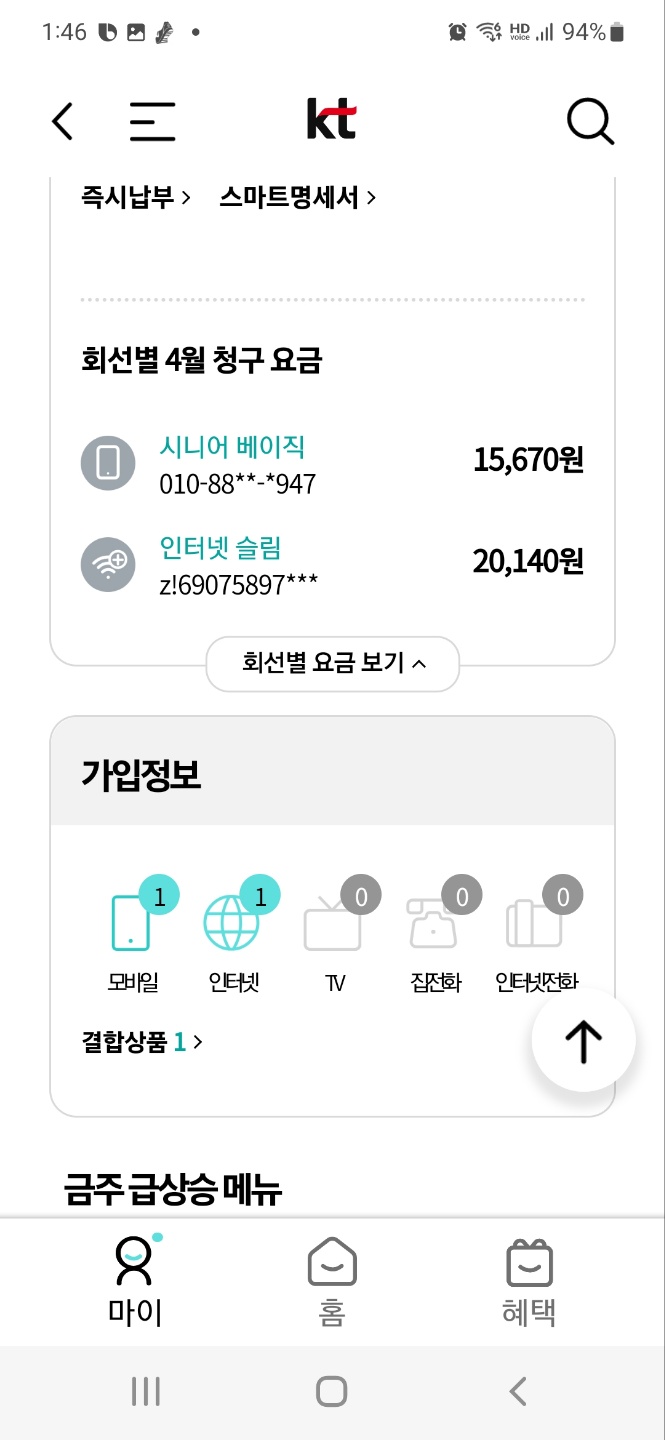 모바일은 이번 달에 자급제핸드폰 사드리고 시니어 베이직으로 변경시켜 드렸습니다