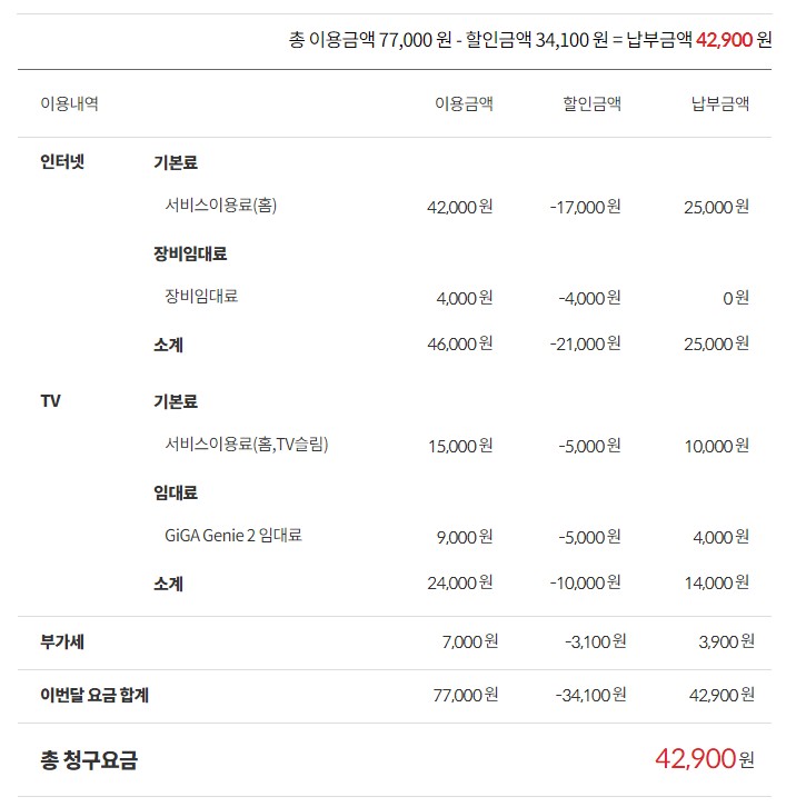 이와 별개로 인터넷 + TV설치비 38,500원이 첫 달 요금과 함께 청구됩니다.