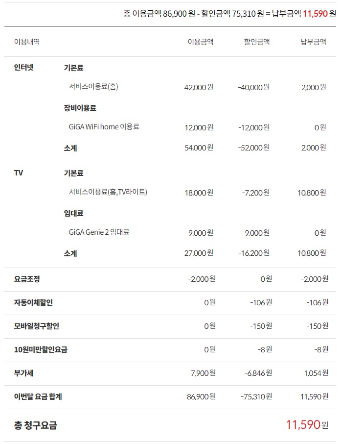 *기가급 인터넷 요금 5,500원 할인 + 핸드폰 요금 22,110원 할인 = 총 27,610원의 혜택