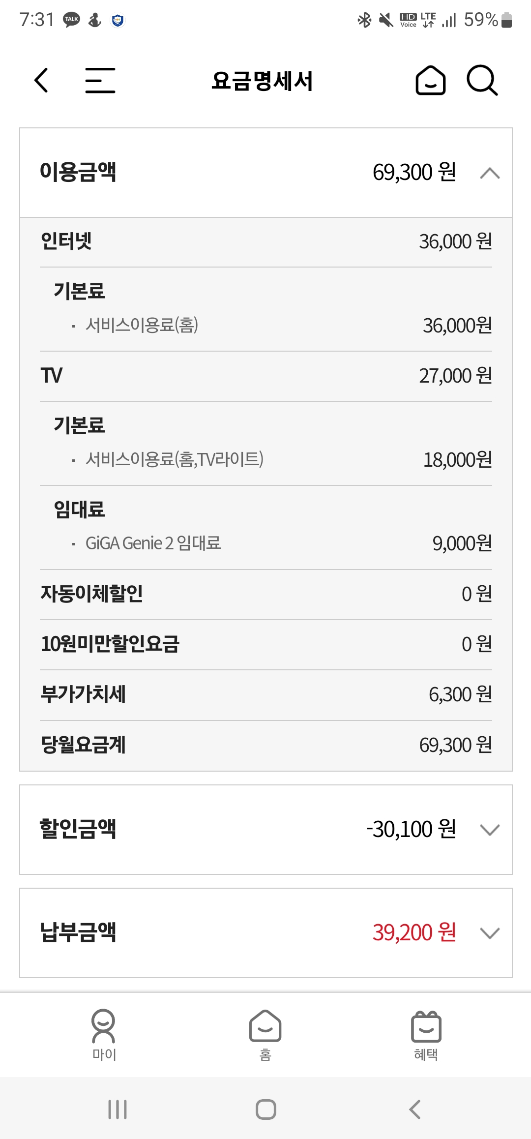 첨부해주신 이미지를 보니 특별히 할인받고 계신 게 없는 걸로 미루어 보아