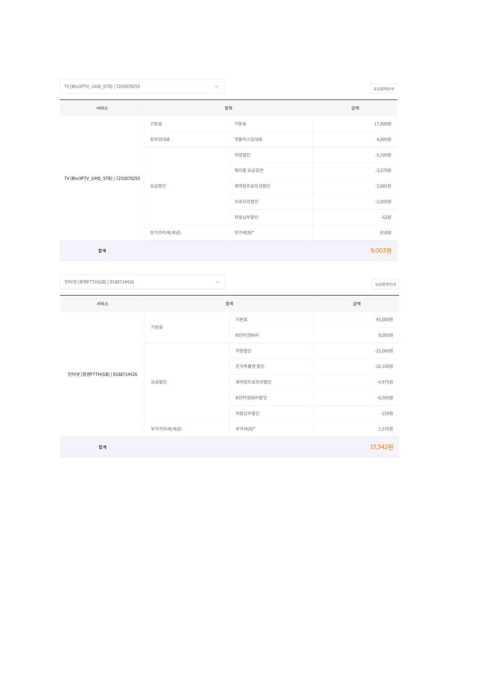SK는 재약정으로 7천원 정도 할인이 들어가고 있고, 13,000원 정도 유무선 결합 할인을 받고 있긴 하지만