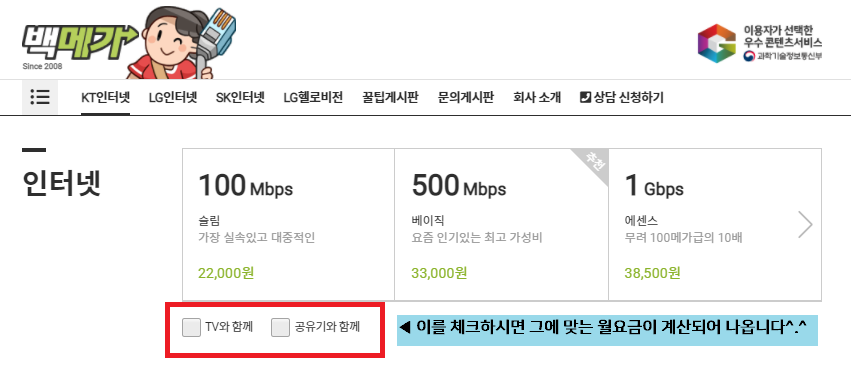 [공유기와 함께] 앞에 체크박스를 누르시면 인터넷 요금이 공유기값과 합산되어 표기되거든요 ㅎㅎ