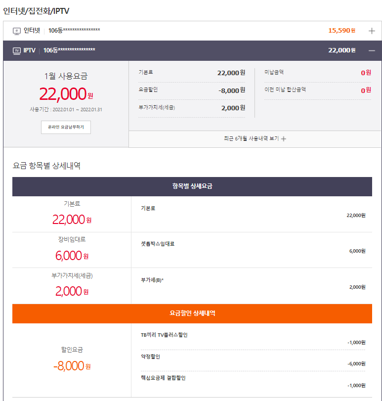 2. 티비쪽은 따로 부가서비스나 월정액 상품 가입은 없구요.(셋톱 임대료 때문에 요금이 많아 보일수도 있겠네요....)