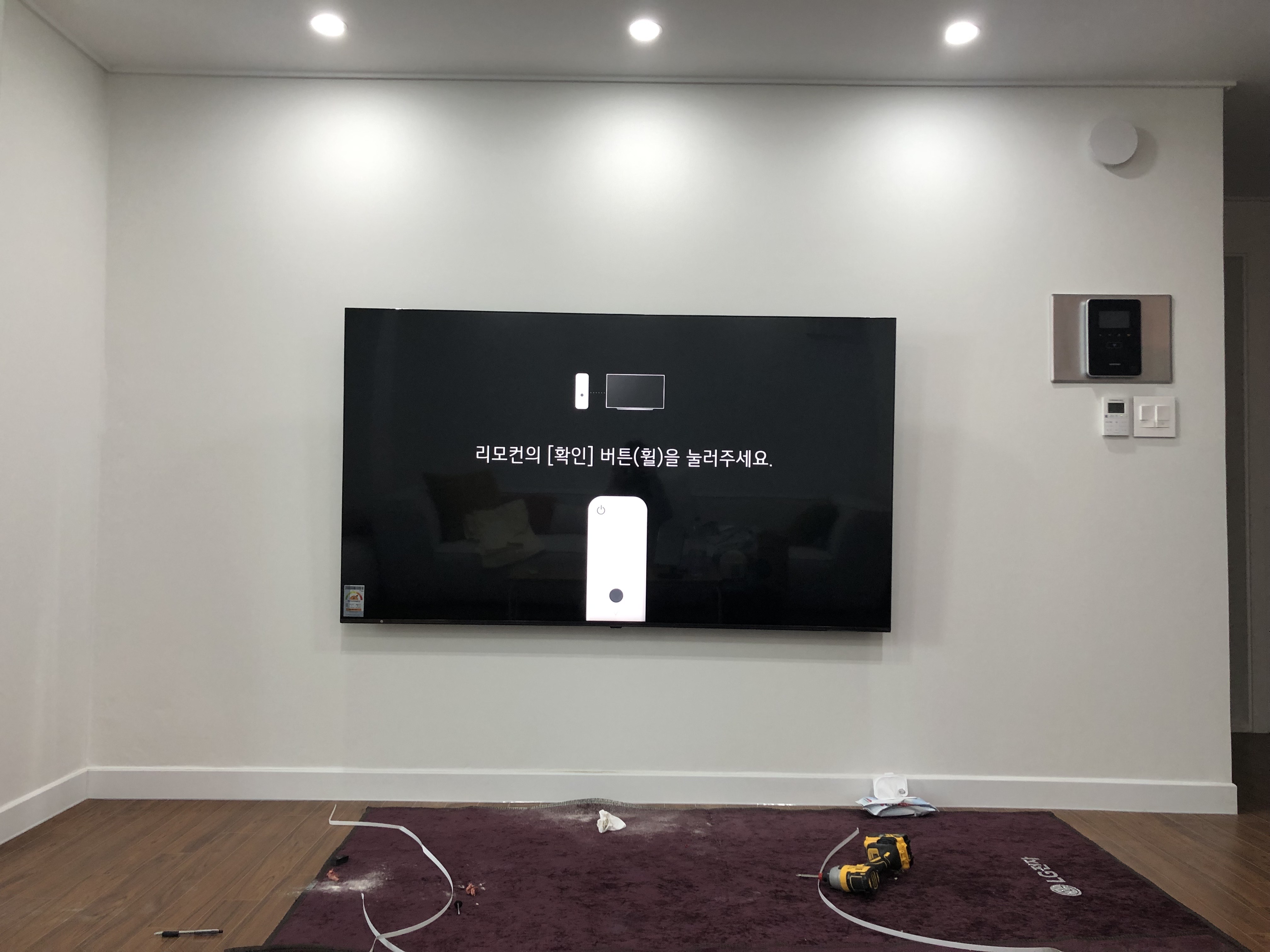 티비가 설치되는 거실벽면에 비디오폰이 있어요. 티비 바로 오른쪽에 있습니다. (첨부사진참조)