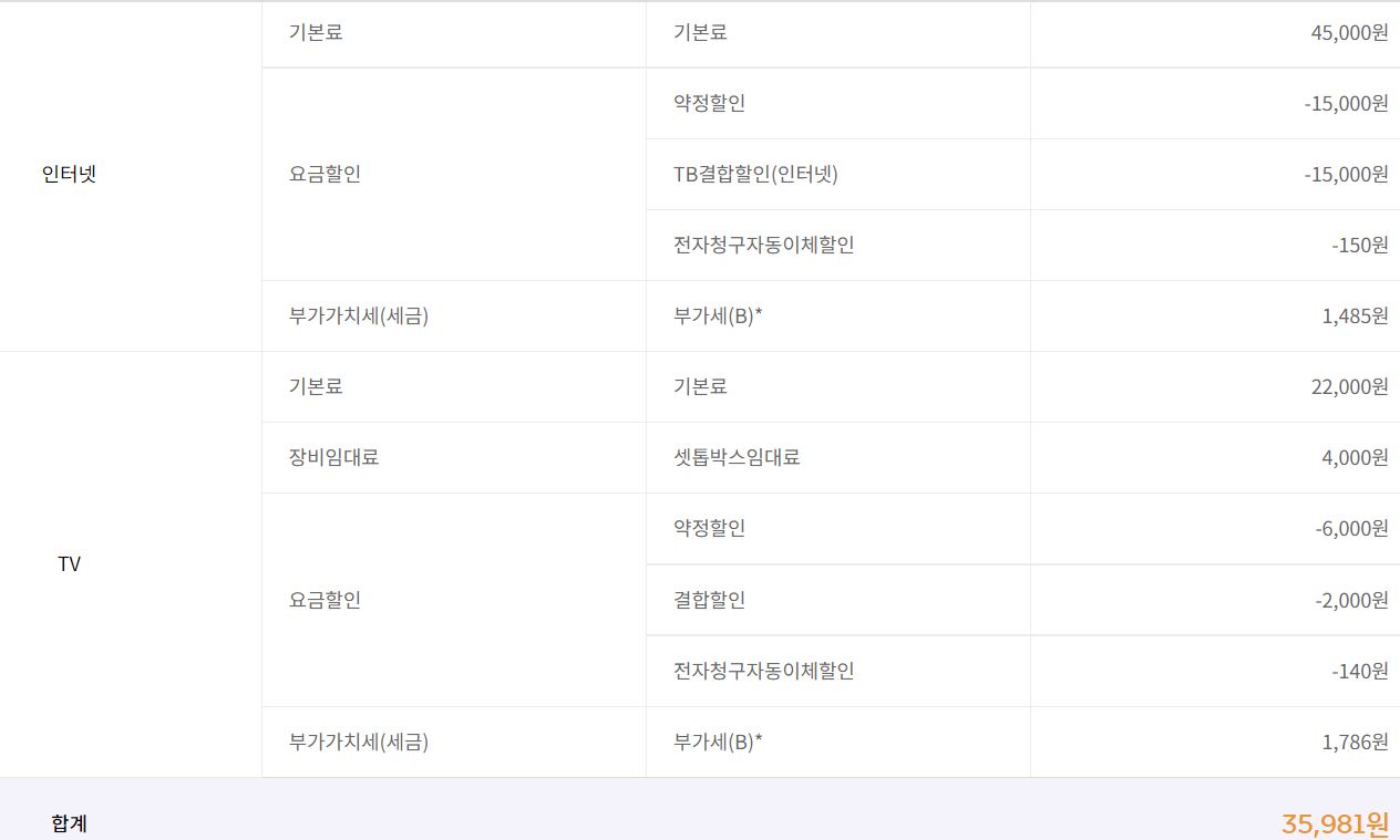 결합 : SKT(이건 30년이상 합쳐진 온가족 할인이라 바꿀수가 없습니다.)