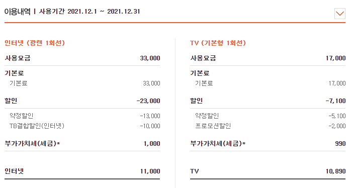 * 월요금 : 100메가 패밀리 자회선 인터넷 16,500원 + 베이직 TV (UHD4셋톱) 16,500원 = 총 33,000원 부과