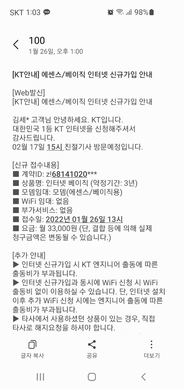 KT 500메가급 인터넷 단독 : 3년 약정 신규가입 진행시