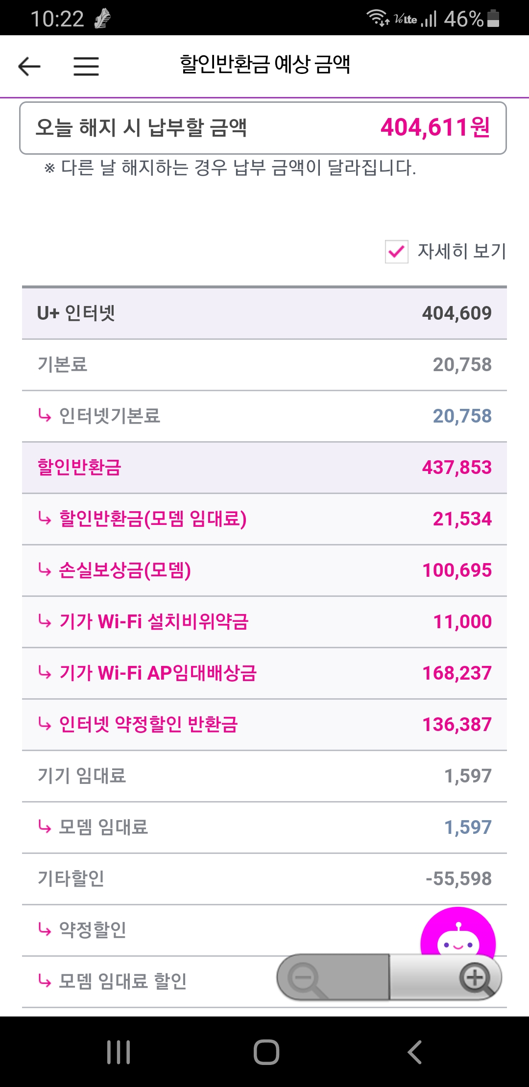 9개월 정도썼는데 집주인분이 건물에 인터넷설치했으니 무상으로 쓰라고 해서 약정 해지를 하려고 고객센터 어플을 확인하니 예상할인반환 금액이 사진처럼나오내요