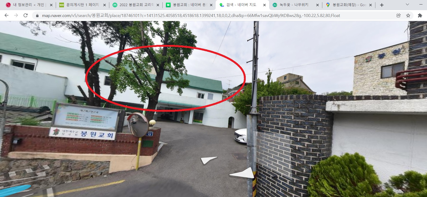 전산 상에서 봉원교회 전체를 뭉뚱그린 장소와 봉사관, 두 곳이 확인되고