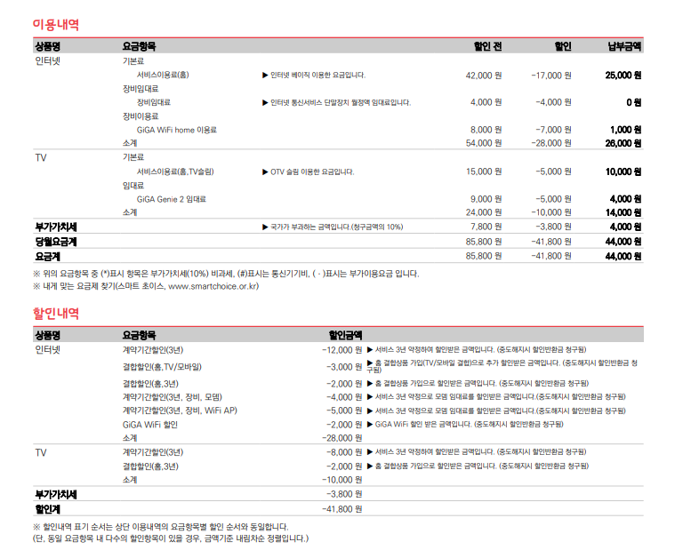 -> 예시 : 부모님 LG 100메가 + 와이파이 공유기 + 티비 1대 = XXX원 / 약정 2년 남음!
