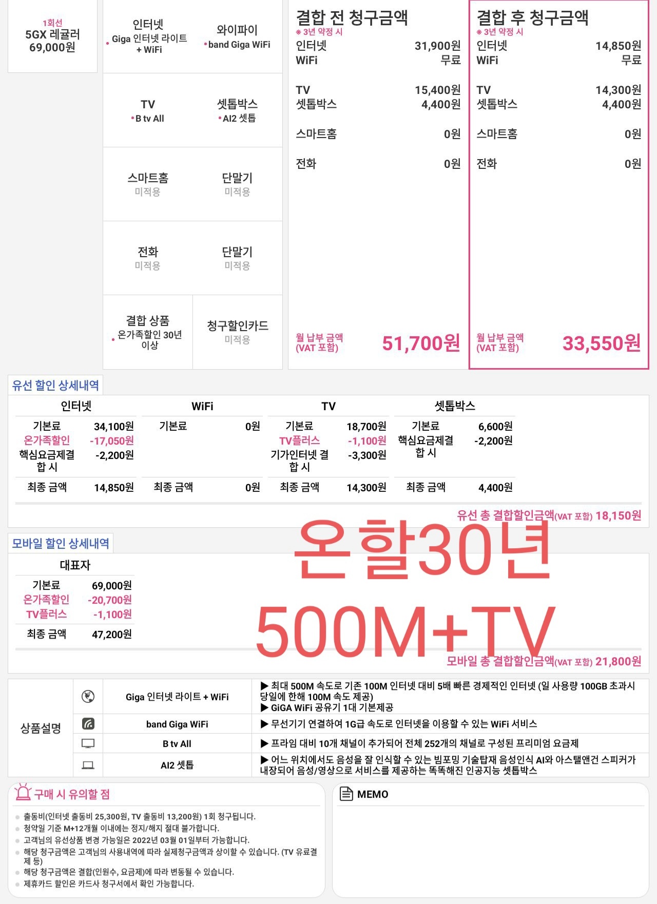 만약 다른 통신사로 인터넷500+TV(제일저렴한거) 로 신규가입 했을경우