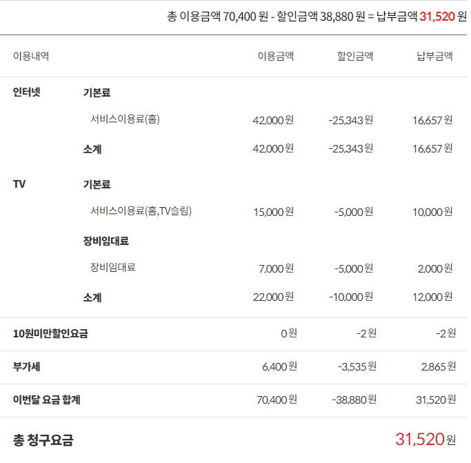 : 인터넷 25,300원 + TV 13,200원 = 총 38,500원 부과
