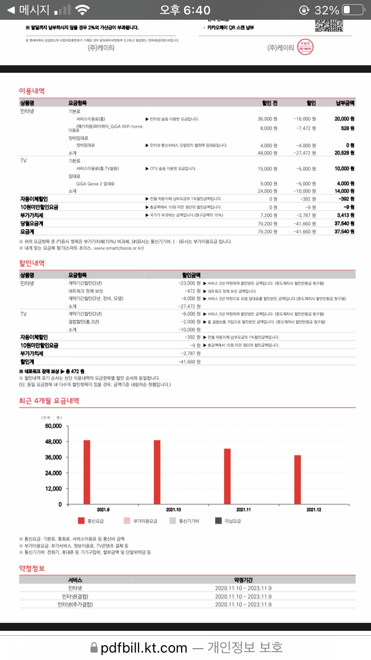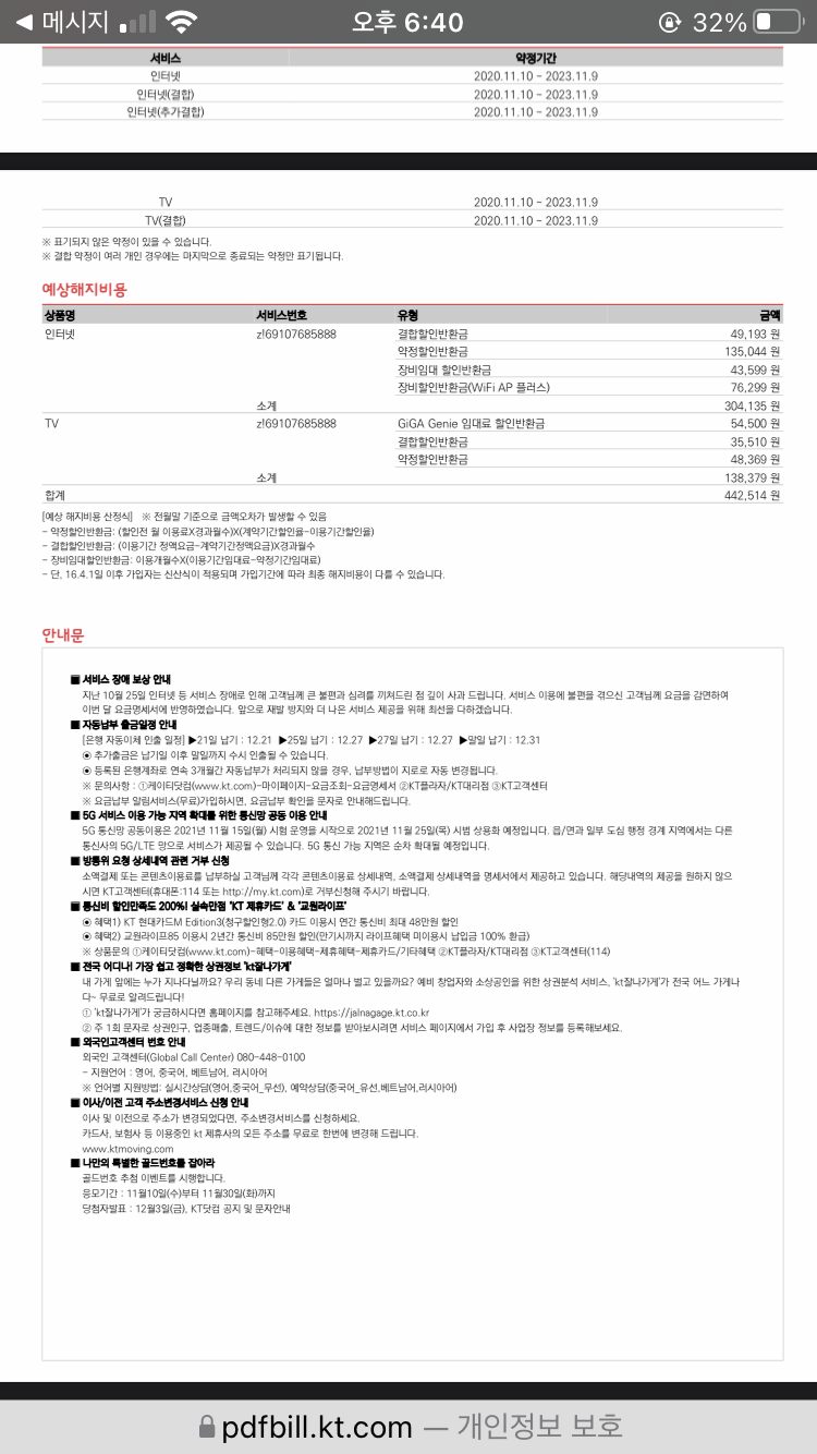 최근에 KT인터넷 슬림 상품으로 교체했어요. 약정 기간이 2023년 11월 9일까지네요.