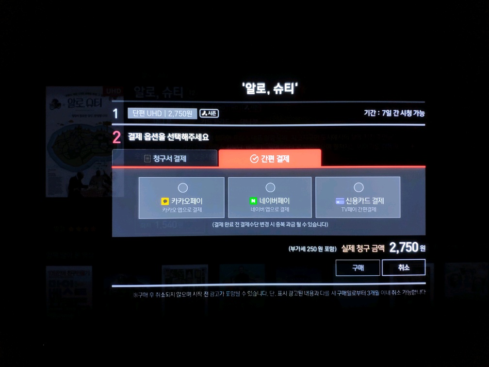 카톡 내에서 결제한 후 TV에 떠있는 구매 완료 버튼 누르면