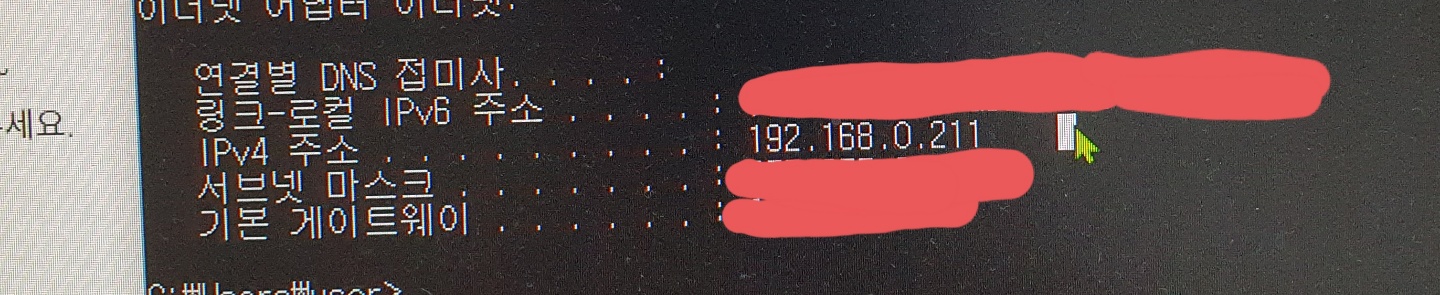 ② 콘솔창(검은창)에다가 ipconfig 라고 입력해주시구요~