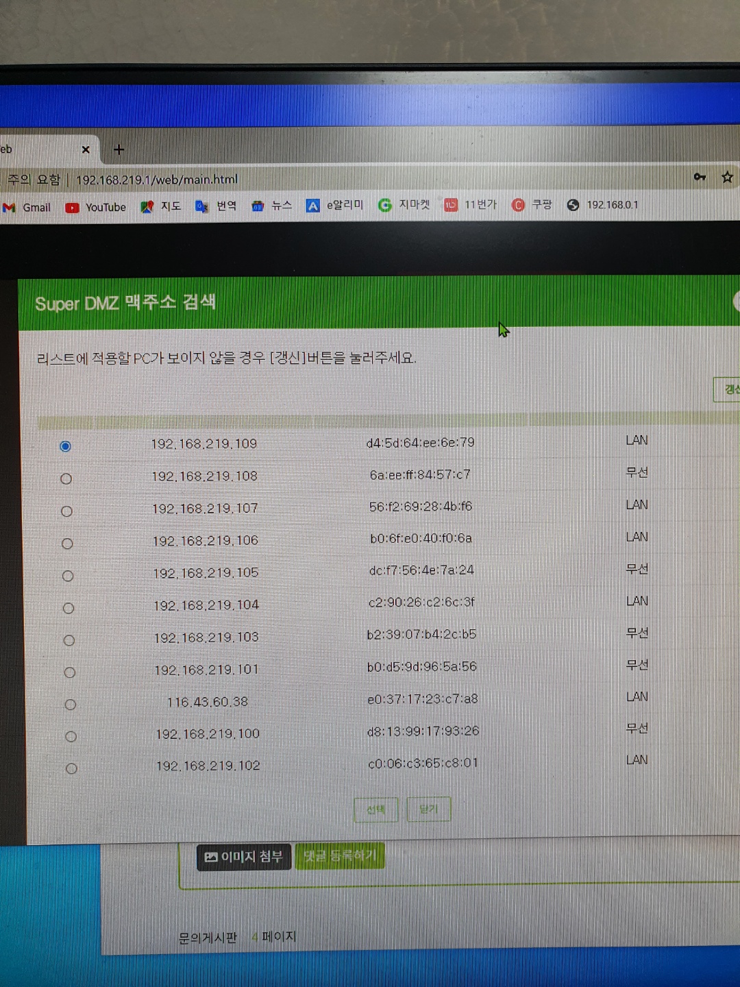 그리고 [맥주소 검색]을 눌러보시면 LG공유기에 연결된 단말기들이 쫙 보이실 텐데